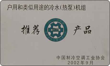 2002年9月,集團“戶用和類似用途的冷水熱泵機組”被中國制冷空調工業協會評定為推薦產品。
