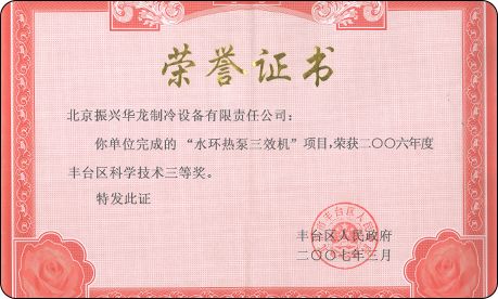 2007年7月,公司“水環熱泵三效機”研發項目,榮獲豐臺區科學技術獎三等獎。
